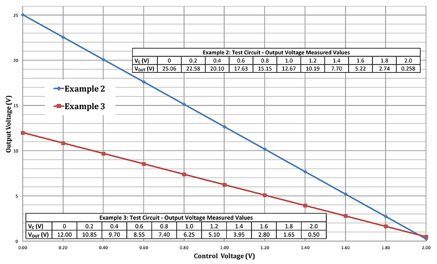 在此示例中,我們希望使用從05.0V的控制電壓來生成從1.0V10.0V的輸出電壓,即,在Cmax = 5.0V時出現(xiàn)的OUTmin = 1.0V ,并且OUTmax = 10.0V(在C = 0 時發(fā)生)。