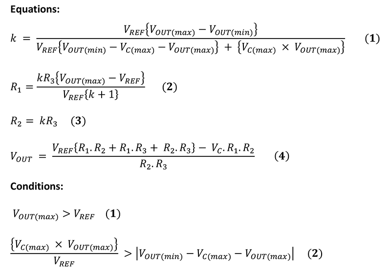 重要的是要滿足圖2所示的條件。第一個條件要求OUT的最大值必須大于V REF。必須確保等式2的分子不能為負。必須滿足條件2的要求,以確保等式1的分母不能為零或負。