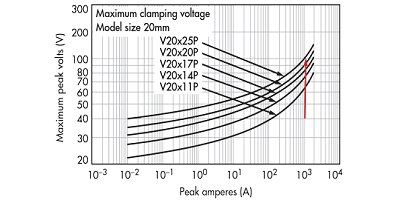 步驟2   要確定要使用的MOV光盤大小,請首先確定最小滿足1000-A浪涌要求的MOV系列。檢查上表建議使用20毫米MOV31伏直流最大連續(xù)額定電壓(部件號V20E25P)作為滿足要求的可能解決方案。