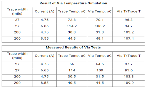 據(jù)我所知,這些測量值提供了根據(jù)IPC 2152標(biāo)準(zhǔn)設(shè)計的走線及其連接的通孔中溫度的首次比較。下表列出了這些測量結(jié)果和模擬結(jié)果。